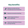 ✓ Anxiety or fear in specific situations, such as thunderstorms, fireworks, busy environments, loud noises, or during travel and car journeys