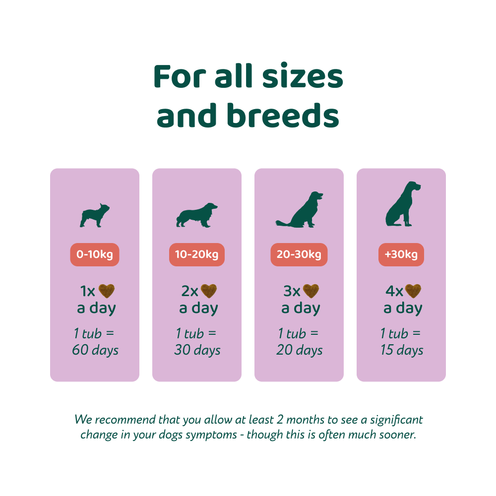 Our formulas are calculated based on your dog's weight. For optimal results, give one chewy per 10 kg of body weight.