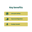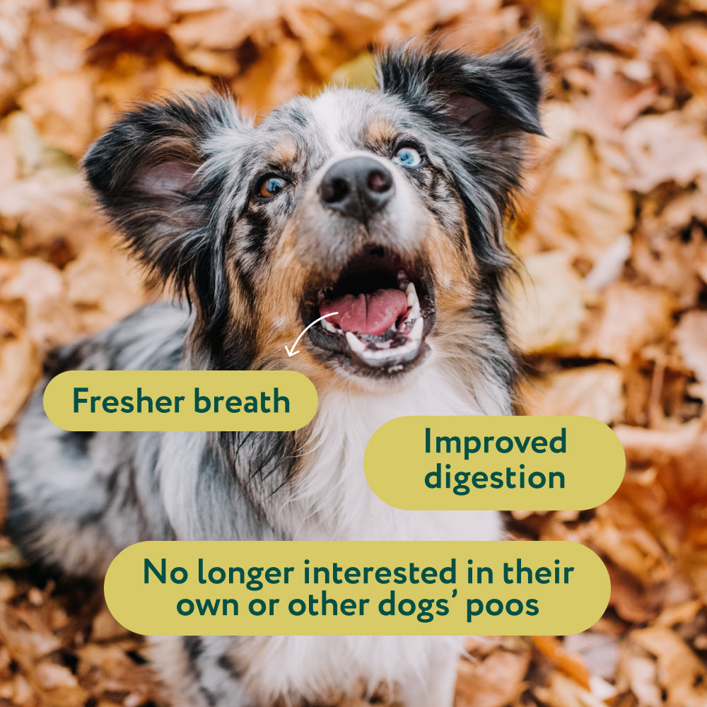The formula supports digestion and contains ingredients that make poos less appealing. It also helps freshen your dog’s breath, which is often an issue with digestive problems.