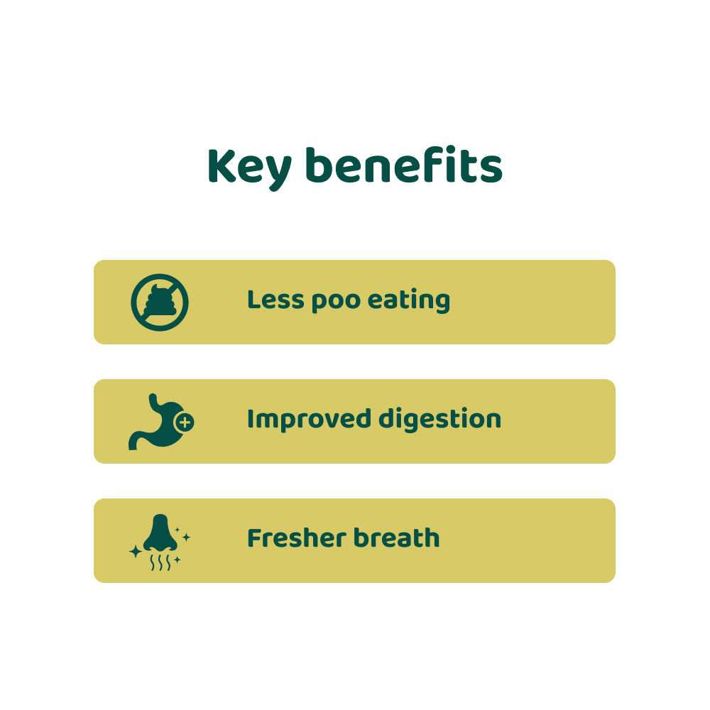 Together, these ingredients provide a natural and effective solution: they make poo less appealing, support digestion, and help keep your dog healthy overall.