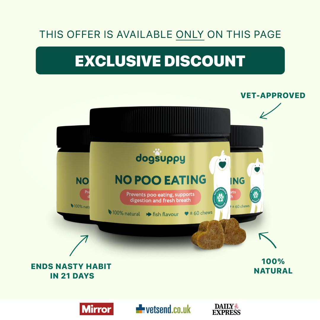 No Poo Eating is a natural supplement in the form of tasty chews that help stop your dog from eating poos.