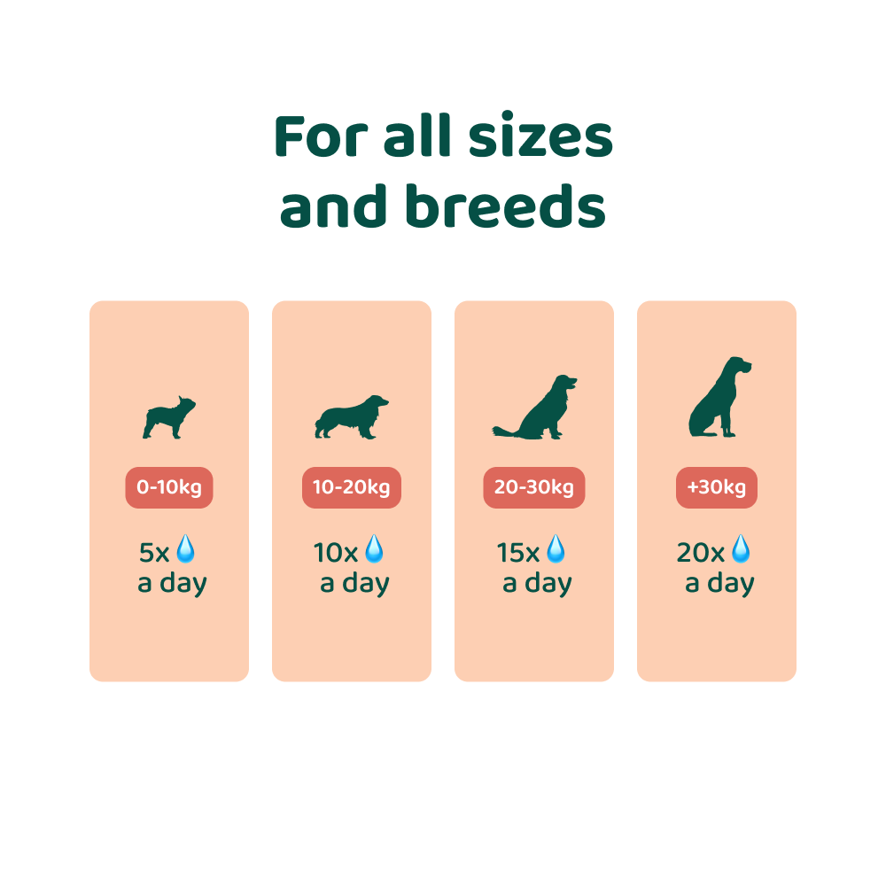 Our formulas are calculated based on your dog's weight. Per 10 kg body weight you can spray 5 times over your dog's food.